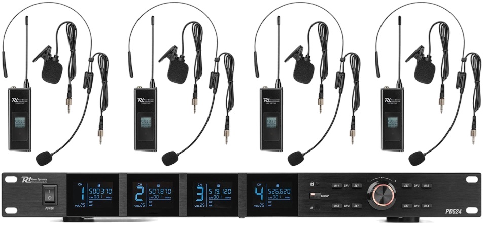 Central 4x Microfones Cabeça/Lapela UHF 100 Canais s/ Fios (PD524C) - Power Dynamics