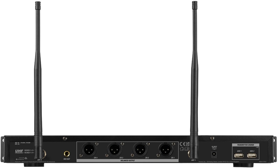 Este conjunto vem com um receptor UHF de 4 canais, quatro transmissores bodypack com bateria recarregável de iões de lítio, quatro auscultadores na cor da pele, quatro microfones de prendedor de gravata, duas antenas BNC removíveis, dois cabos extensores para montagem frontal das antenas, um adaptador de corrente e uma caixa ABS. Quatro cabos USB para carregar os microfones sem fios também estão incluídos.