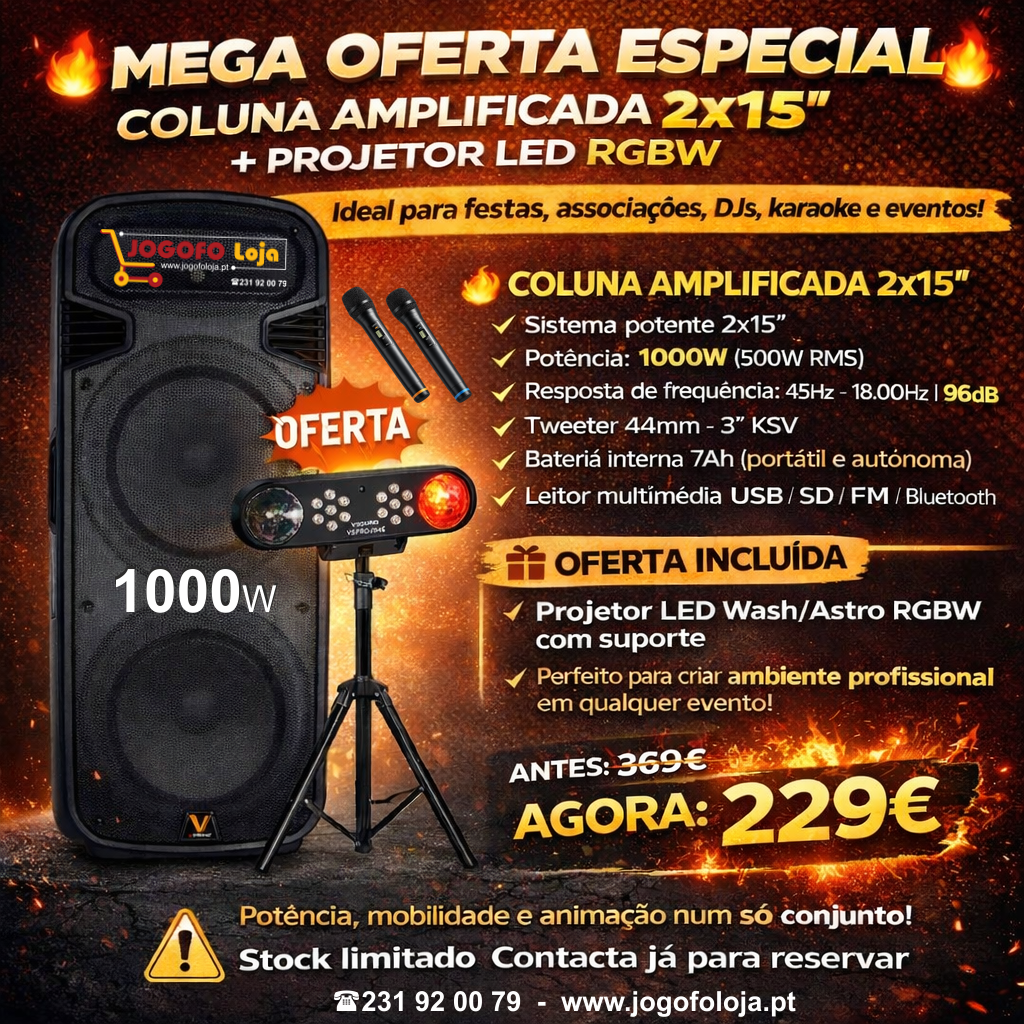 Coluna amplificada 2x15 preta com projetor LED RGBW e microfones em suporte sobre fundo laranja com texto promocional.