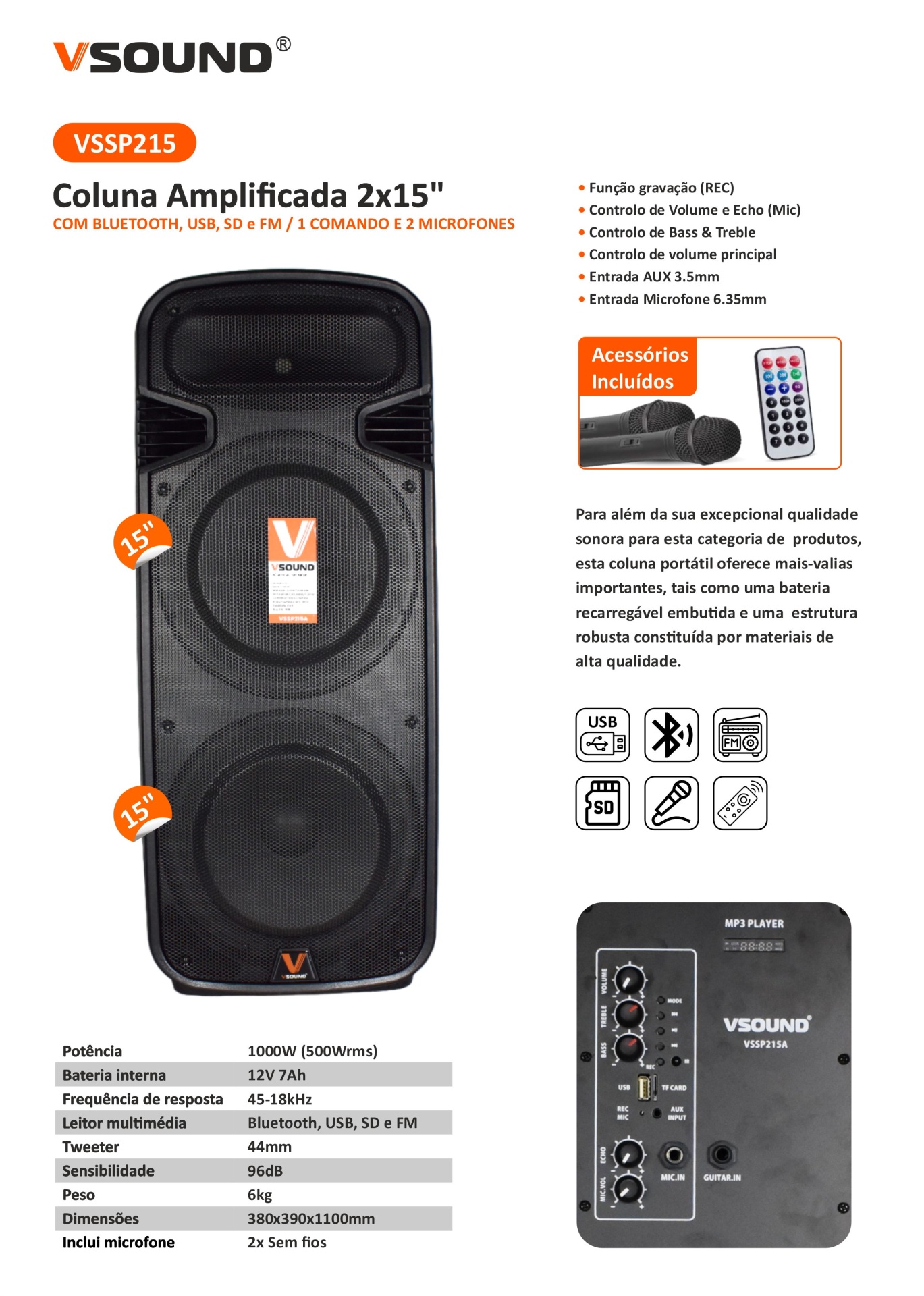 Home Sistemas de Audio Coluna Amplificada 2x15" USB/FM/BT/SD/BAT 2xMICRO sem FIO 1000W -45.65% Coluna Amplificada 2x15" USB/FM/BT/SD/BAT 2xMICRO sem FIO 1000W SKU: 1 199,88 € 367,77 € Desconto de 45.65%. IVA incluído. Comprar Contactar - Coluna amplificada 2x15" + tweeter 3"- Leitor multimédia USB/SD/FM e Bluetooth- 2 Microfone de mão UHF s/ fios - Função de Gravação de som - Controlo de Volume Master, micros, Graves , Agudos, Echo - Entradas Line-IN, bluetooth, Pen, e micros com fio - Comando à distancia- Potência: 1000W (500 WRMS)- Frequência resposta: 45-18.000Hz, 96dB- Bateria interna 7Ah, Tweeter 44mm, 3" KSV- Peso: 27.70 kg- Dimensões: 380x390x1100 mm Marca VSound PRO Tags COLUNAAMPLIFICADA1000Wmicro sem fiovsoundportátil Partilhar