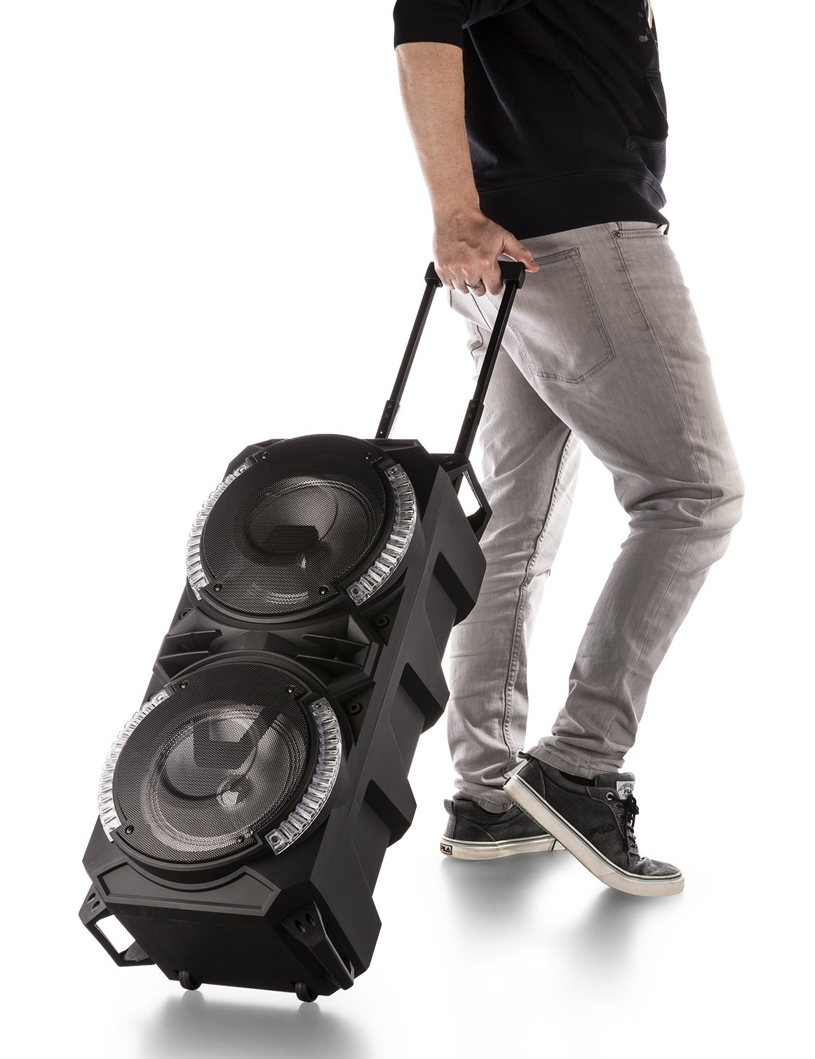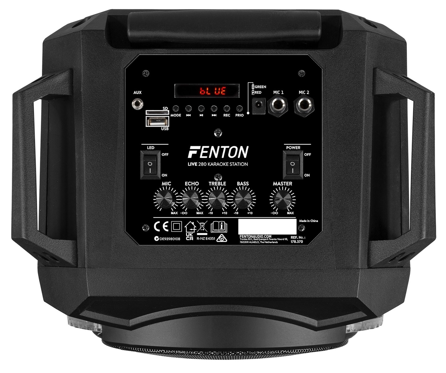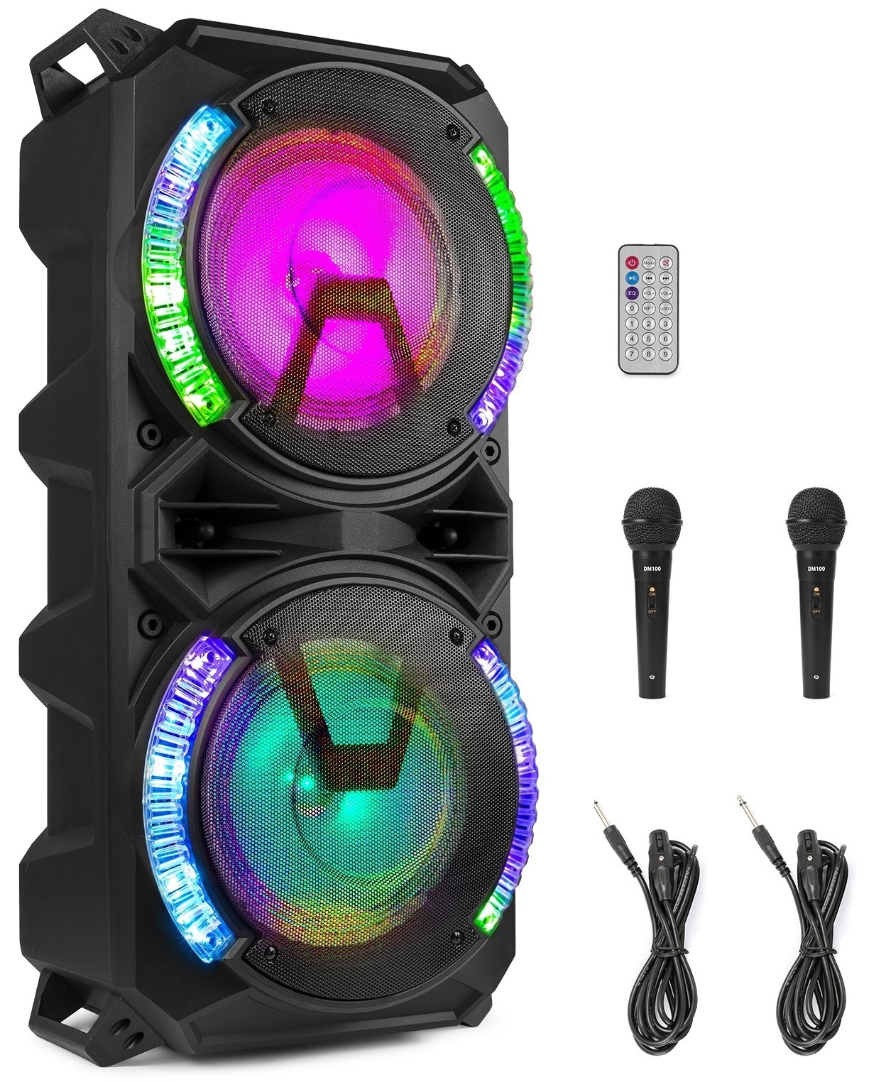 Esta poderosa coluna 2x 8 "com bateria e amplificador embutidos vem com 2 microfones. Também é equipado com tecnologia BT para transmitir as suas músicas favoritas do seu smartphone, tablet ou PC e um reprodutor de mídia integrado para conectar um cartão microSD / USB stick para reprodução direta de música. As luzes LED RGB com controle de som selecionável ao redor das colunas adicionam um efeito incrível a qualquer festa ou evento. Para aqueles que preferem uma abordagem mais descontraída, há um controle remoto incluído para controlar o LIVE280 à distância.