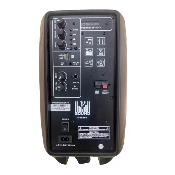 Home Sistemas de Audio Coluna Amplificada VSOUND VSSE8PM 8" USB/BT/SD/BAT MIC s/Fios Coluna Amplificada VSOUND VSSE8PM 8" USB/BT/SD/BAT MIC s/Fios 159,00 € Desconto de %. IVA incluído. Comprar Contactar -Coluna amplificada 8" 2 vias c/ 1 MIC -Potência: 350W (175 WRMS) -Leitor multimédia Bluetooth, USB, SD e FM -Inclui 1 MIC s/ fios de mão c/ suporte -Frequência resposta: 80-18000Hz, 94dB -Tweeter: 25mm, bateria interna 12V 4.5Ah -Dimensões: 230x230x390 mm. -Peso: 6kg Marca VSound PRO Características Partilhar