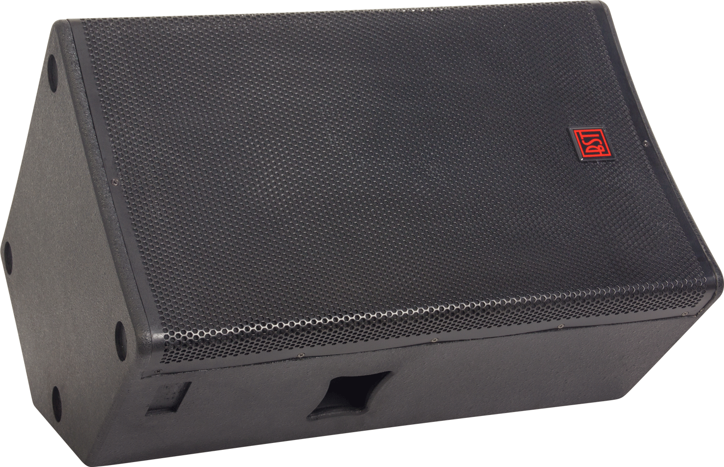 Coluna de som profissional preta BST com características técnicas e logos visíveis