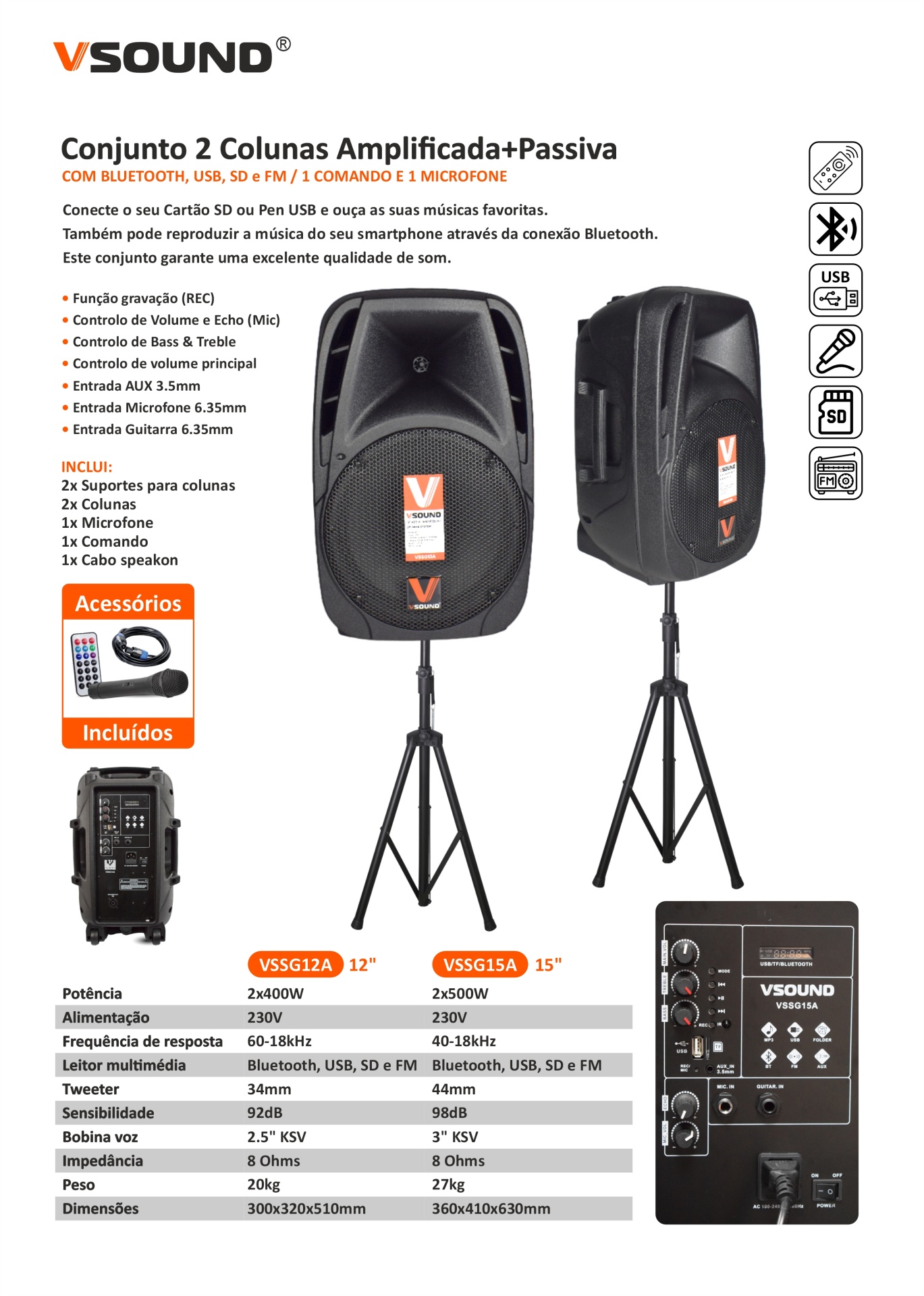 Home Sistemas de Audio COLUNAS ATIVA+PASSIVA 12" 2x400W USB/BT/SD MICRO VSOUND -38.39% COLUNAS ATIVA+PASSIVA 12" 2x400W USB/BT/SD MICRO VSOUND 219,00 € 355,47 € Desconto de 38.39%. IVA incluído. Comprar Contactar - 2 x Coluna Amplificadas 12" ABS- Potência: 2x400W (2X200 WRMS)- Tweeter: 34mm, bobina voz: 2.5" KSV- Impedância: 8 Ohms, sensibilidade: 92dB- Frequência resposta: 60-18.000Hz- Estrutura em ABS trolley c/ alça, Inclui Microfone c/ Fios- Peso: 27.00 kg- Dimensões: 715x435x615 mm - Inclui 2 suportes tripé de coluna- Inclui cabo speakon 5m- Inclui microfone com fios- Inclui Cabo IEC Marca VSound PRO Tags colunasactivasAMPLIFICADAvsounskaraokeDJ Partilhar