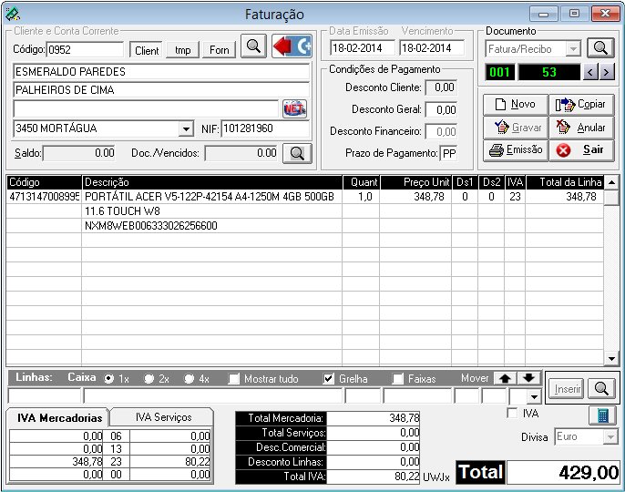 Faturação de mercadorias e serviços, com IVA separado.