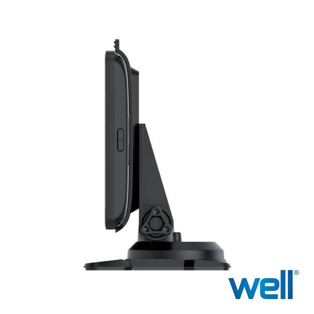 Ecrã digital preto com aplicativo de navegação e música, suporte e logótipo Well