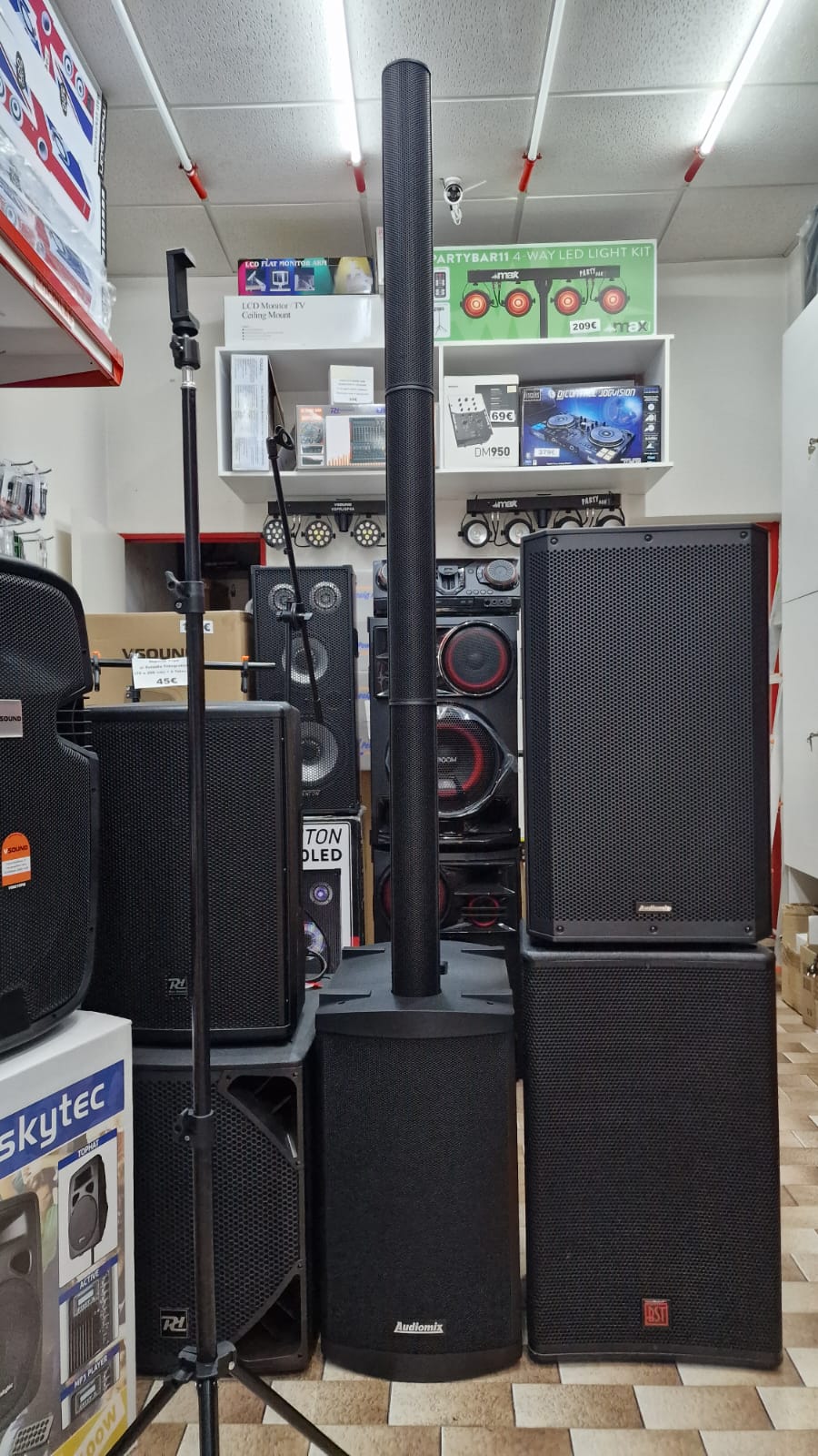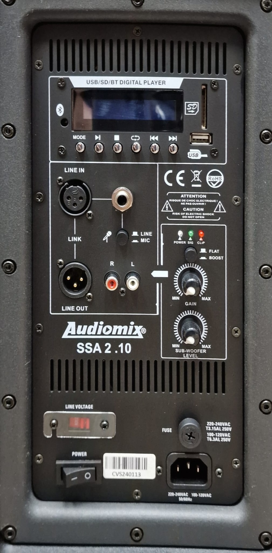 – Sistema amplificado com subwoofer + colunas verticais de encaixe – Coluna vertical é constituida por 3 secções, cada uma delas com 53 cm – Construção robusta para uma excelente performance acústica, robustez e durabilidade – Com módulo leitor MP3, entrada para pen USB e cartão SD, ligação Bluetooth – Entrada Line In e saída Line Out com ficha XLR – Entrada dupla RCA para linha e entrada Jack para microfone – Controlo de ganho geral (GAIN) e controlo volume do subwoofer – Indicadores Led de potência, sinal (SIG), e clip – Interruptor de potência – Flightcase de transporte p/ 2 sistemas opcional – Potência: 500W RMS e 1200W máximo – Altiflantes SUBWoofer: 2 x 10” – Altiflantes colunas: 8 x 2” – Resposta de Frequência: 35 Hz – 20 Khz – Dimensões: Sub 59x35x46 Cm / Coluna vertical – 3 peças de 49 Cm cada – Peso: 34 Kg